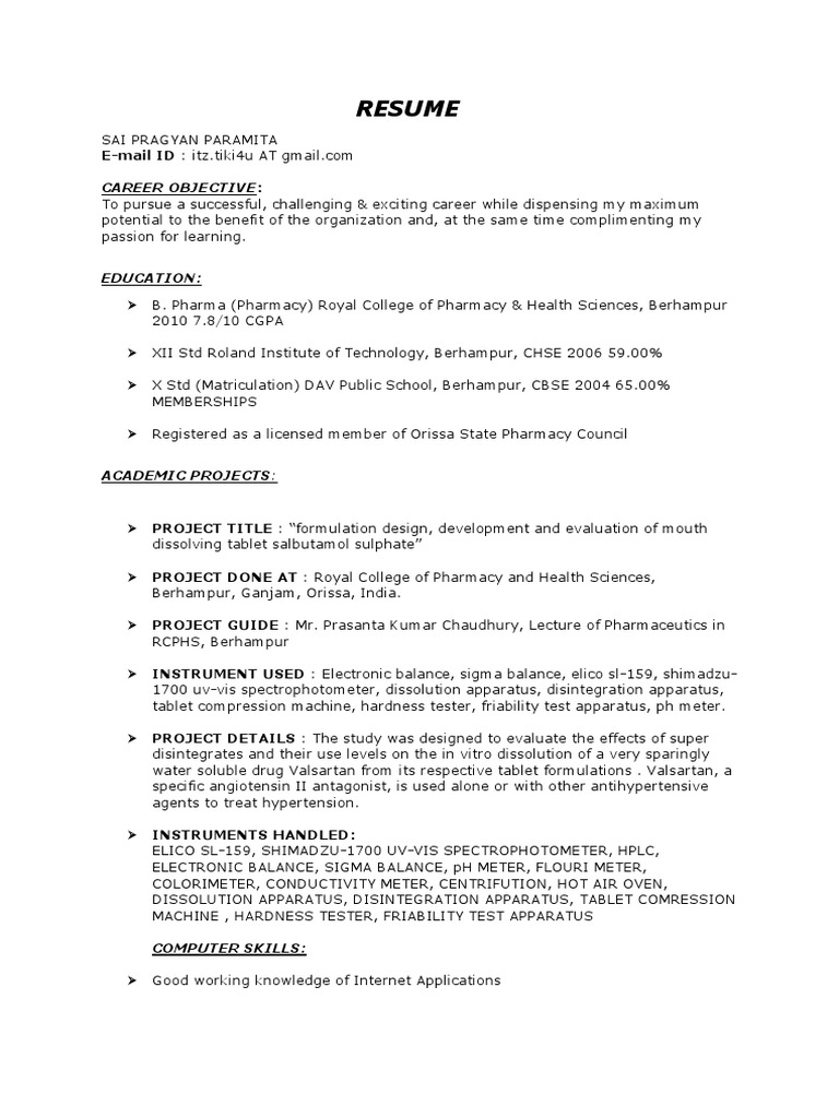 B Pharmacy Resume Format For Freshers Pdf