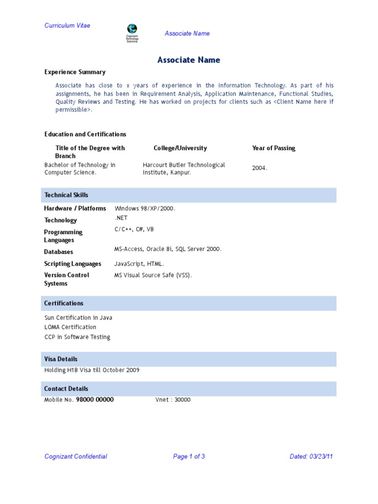 Cognizant Resume Format