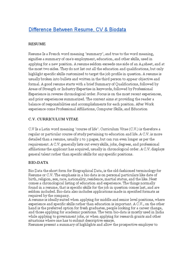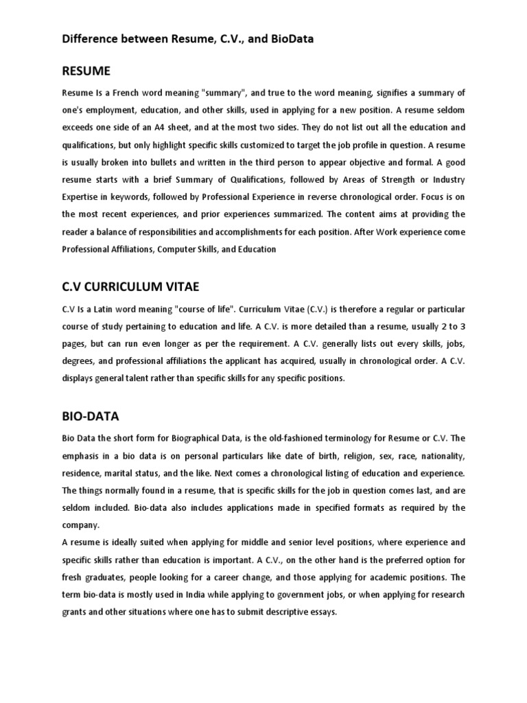 Difference Between Cv And Resume And Biodata Pdf