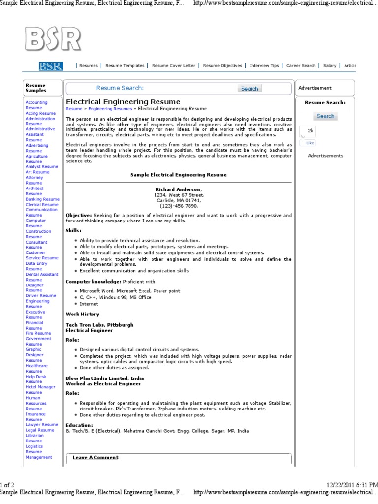 Sample Electrical Engineering Resume Electrical Engineering
