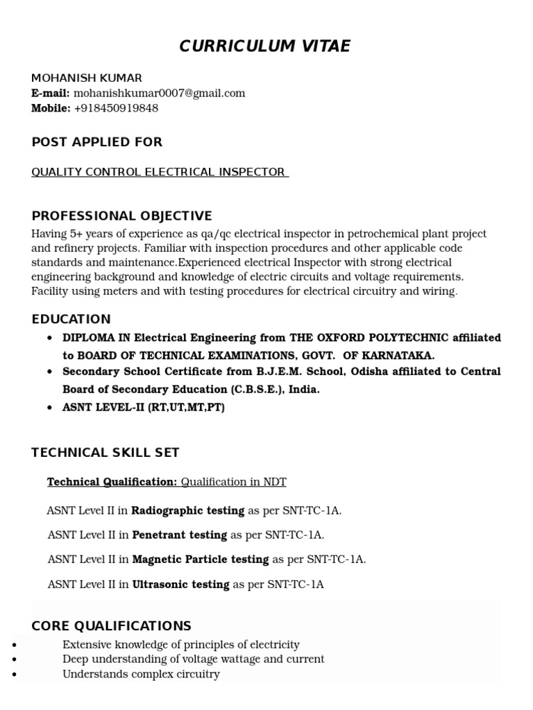Electrical Qa Qc Engineer Resume Best Resume Examples