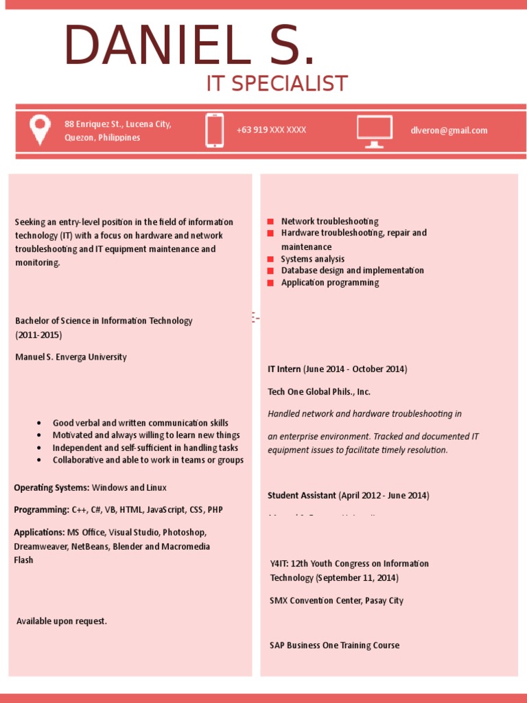 Sample resume for fresh graduates it professional as a fresh graduate applying for an entry level position you don t have to worry about your lack of work experience. Refer to resume rample 2 entry level web developer and resume sample 3 entry level it support specialist for fresh graduate resumes with longer format. Take a look at our free it cover letter example and associated tips here.
