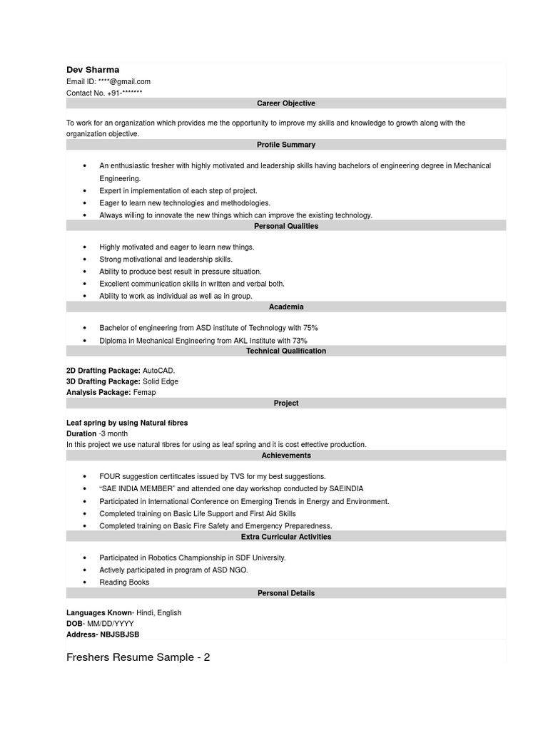 Sample Resume Format For Mechanical Engineering Freshers Filetype