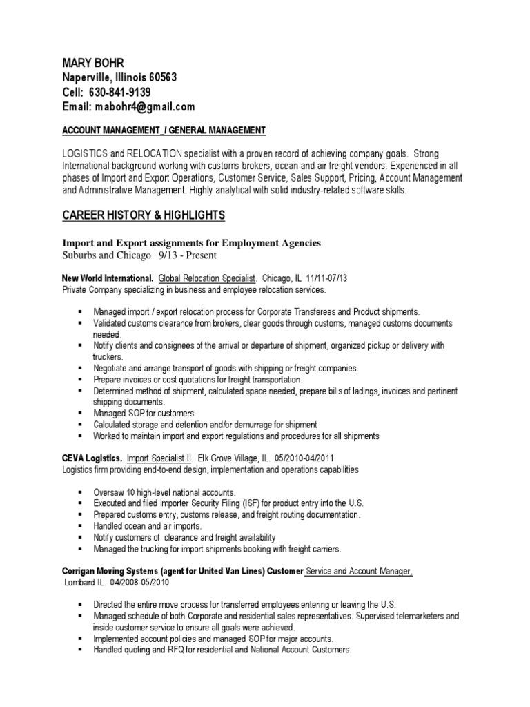 Import Export Logistics Coordinator In Chicago Il Resume Mary Bohr Cargo Logistics
