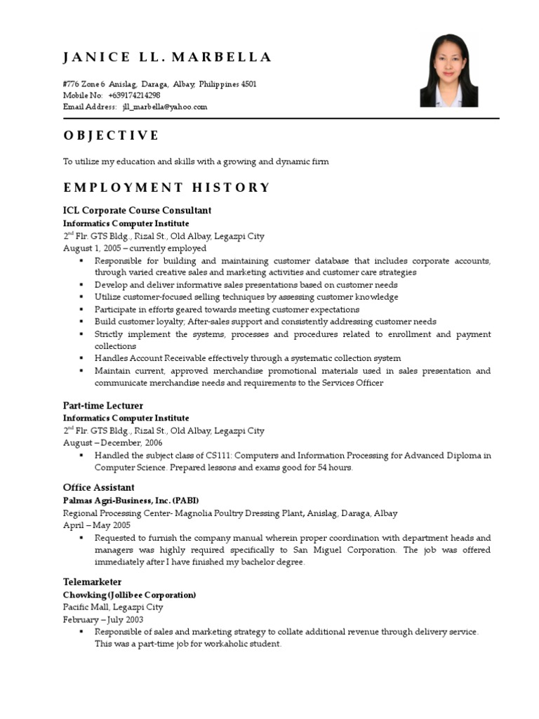 Resume Sample Philippines Setting