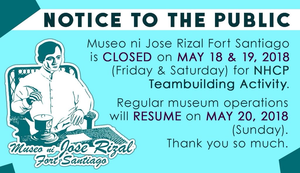 Intramuros Phl On Twitter Please Be Informed That The Museo Ni Jose Rizal Fort Santiago Will Be Closed On May 18