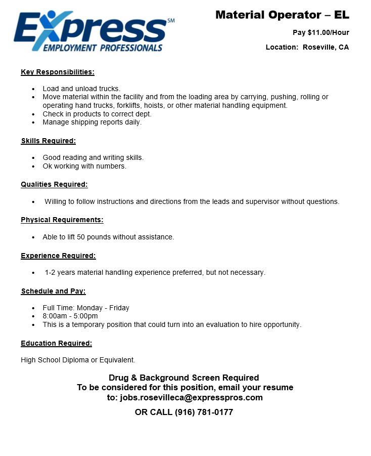 Material Operator Wanted Roseville