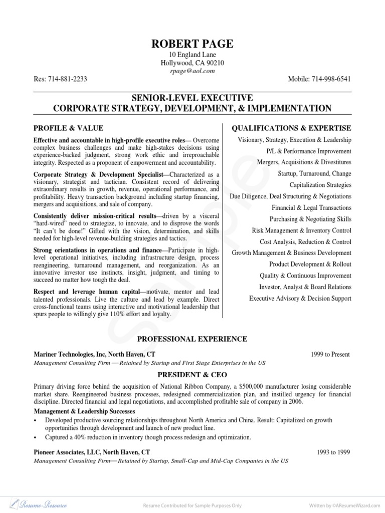 Sample Resume Executive Ceo Strategic Management Mergers And