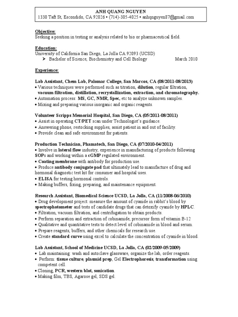 Qa Qc Microbiologist Resume In San Diego Ca Focus In Biotech