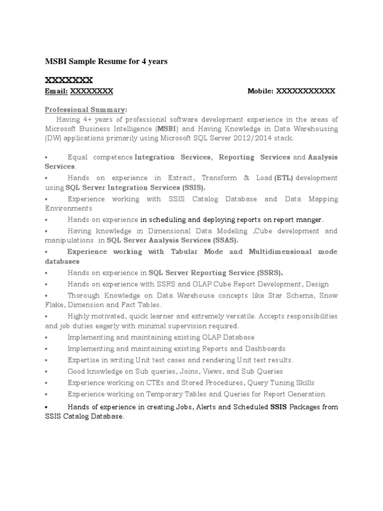 Msbi Sample Resume For 4 Years Microsoft Sql Server Data