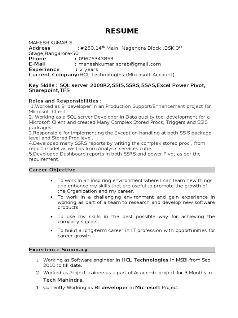 2 Ms Bi Resume Microsoft Sql Server Business Intelligence