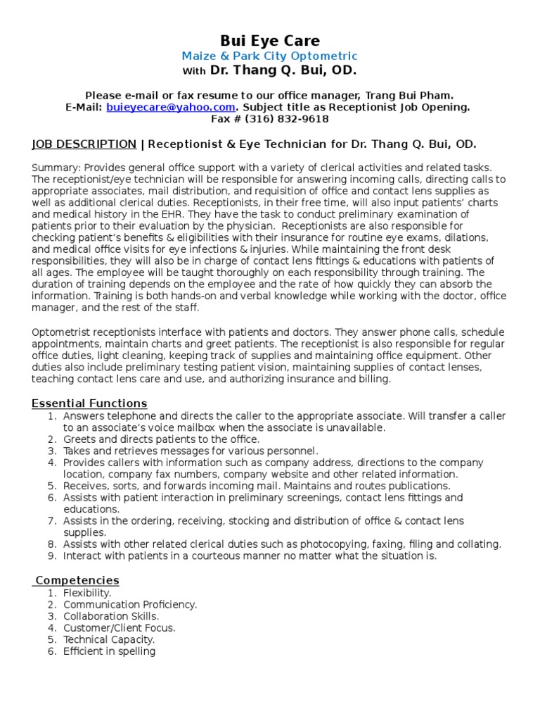 Bui Eye Care Receptionist Job Opening Optometry Contact Lens