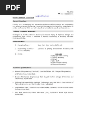Sample Piping Design Engineer Resume Pipe Fluid Conveyance