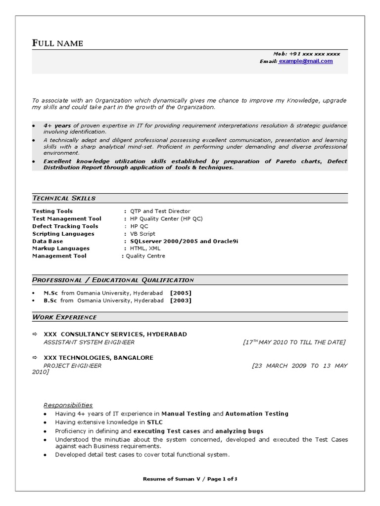 Sample Testing Manual And Qtp Selenium Experinced Resume Akhil