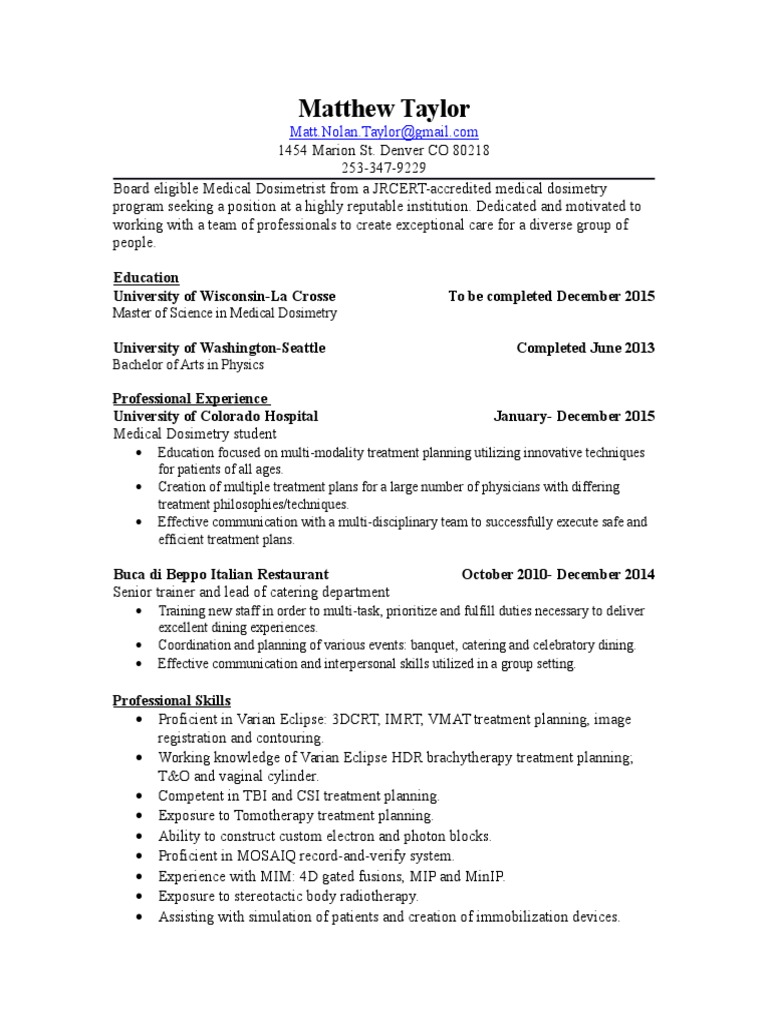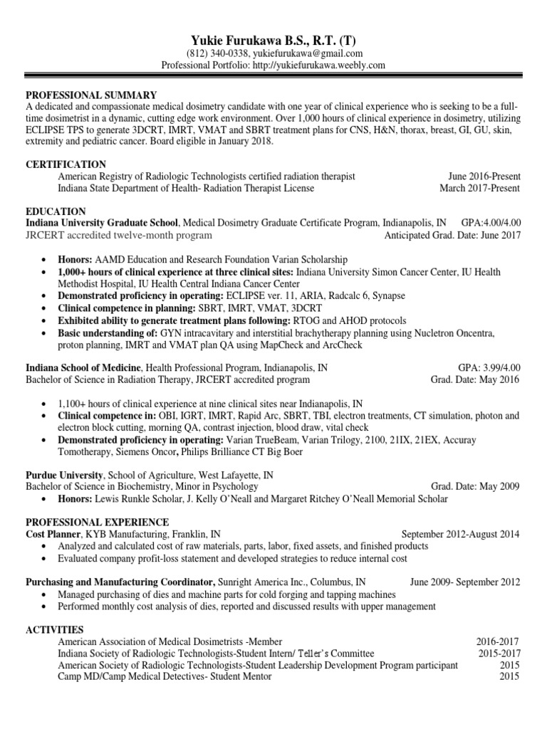 Medical Dosimetrist Resume For Yukie Furukawa 5 9 2017 Radiation