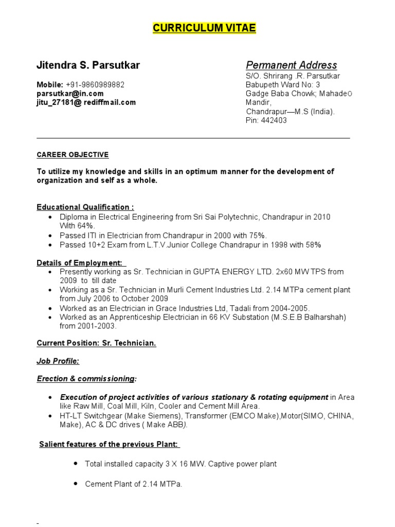 Indian Electrician Cv Word Format Download