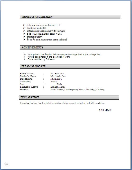 Simple Resume Format For Freshers Pdf 10 Fresher Resume