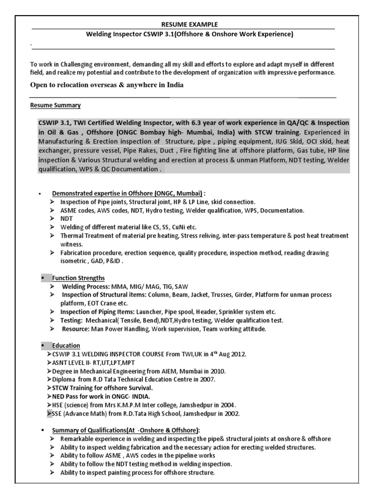 Qc Welding Inspector Resume Template Best Design Tips