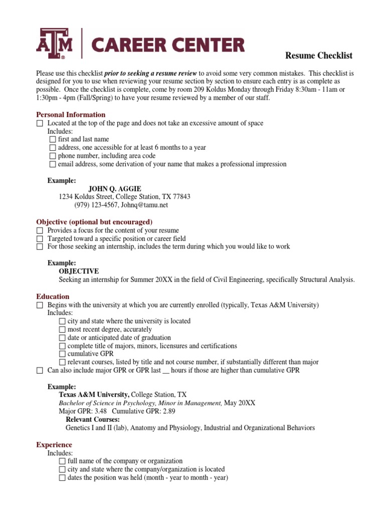 Https Careercenter Tamu Edu Documents Resumes Cover Letters Resumewritingchecklist Sept12