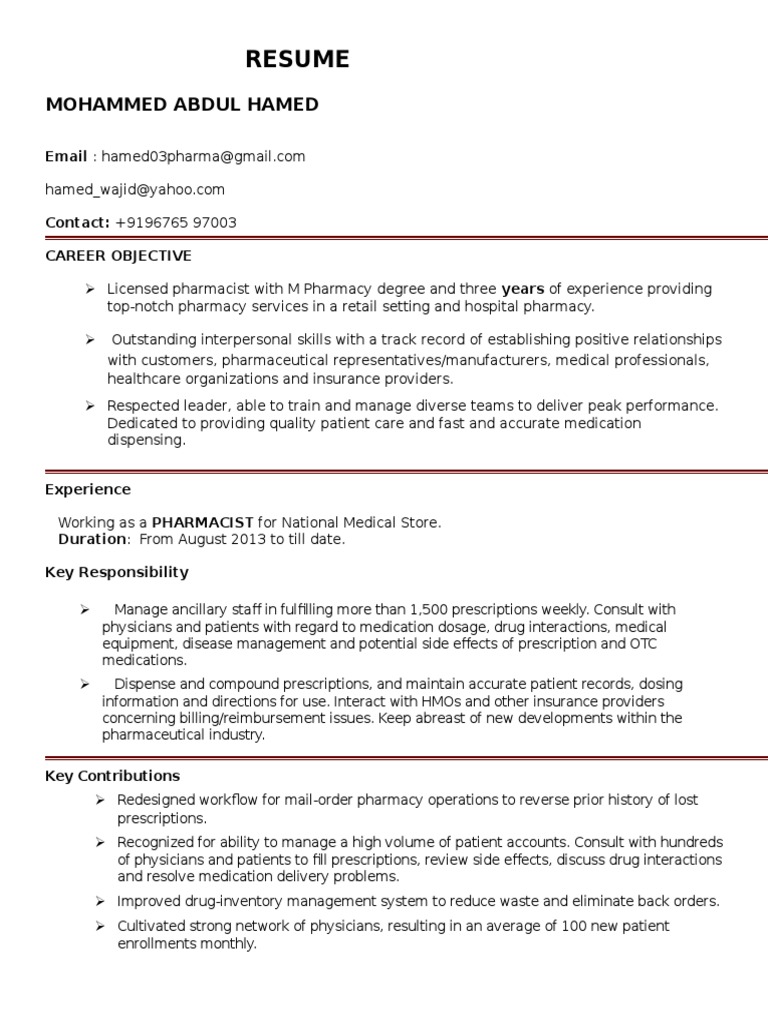 Retail Pharmacist Resume Sample Student Info Student Resume
