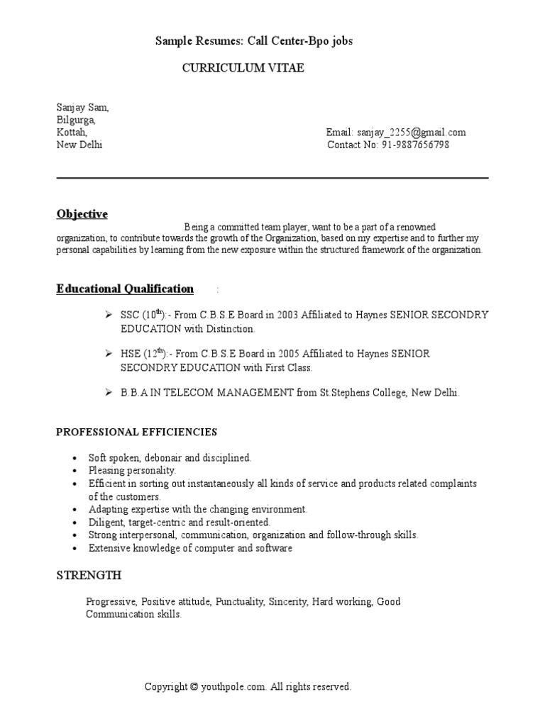 Sample Of Call Center Resume
