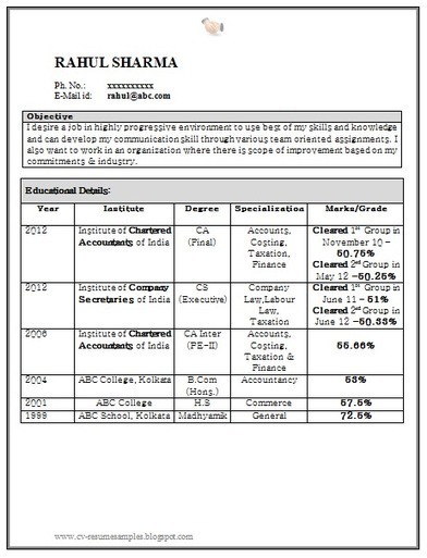 Curriculum Vitae Samples Resume For Fresher Chartered Accountant