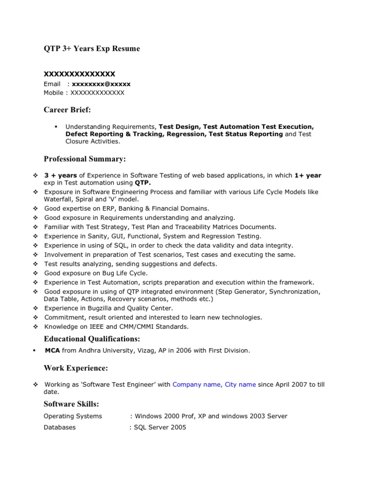 Qtp 3yrs Sample Resume Software Testing Engineering
