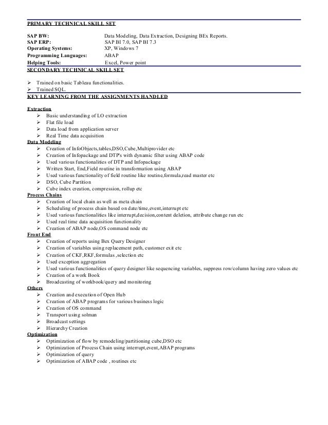 Sap bi bw resume. A typical example resume for this job mentions duties such as training and mentoring other development team members performing business plan analysis supporting end users and planning project execution. Involved in creating and maintaining info cubes data store objects psa info objects info areas multiproviders info sources data sources and info packages. Successfully planned and executed multi year bw roadmap that included security migration to analysis authorizations bw upgrade from nw 7 0 to nw 7 30 and bex migration from 3 x to 7 x.