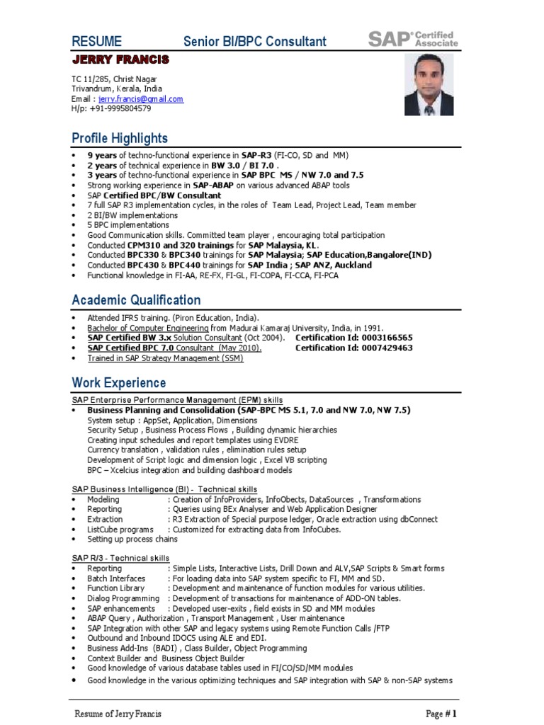 Sap Bpc Fresher Resume Sap Abap Srm Resume Sap Bw Resume Sample