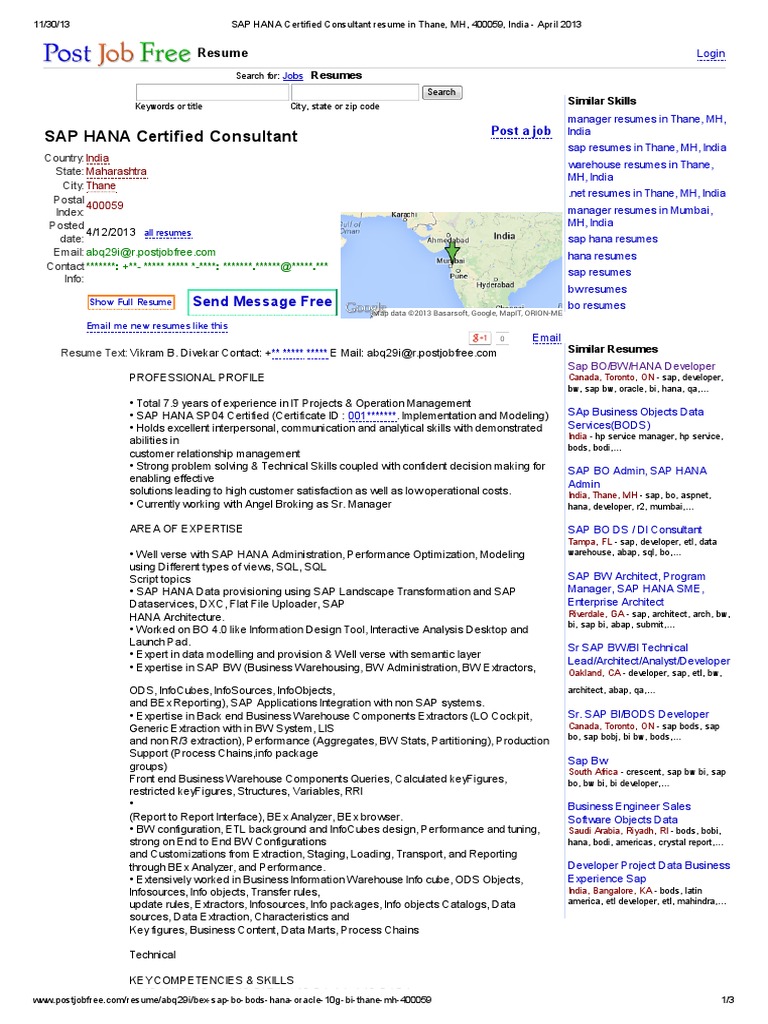 Sap Hana Certified Consultant Resume In Thane Mh 400059 India