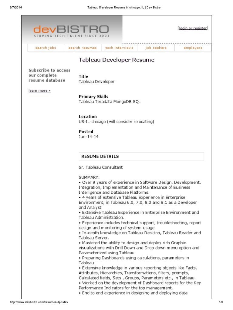 Tableau Developer Resume Oracle Database Databases
